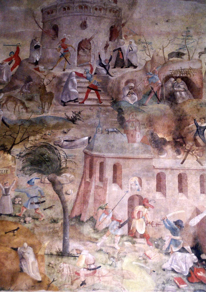 The vehicle builds and builds before this point, almost losing itself in its own story. The woman actually saw her husband as he was dying, witnessed his last gasp (τὸν θνήισκοντα καὶ ἀσπαίροντ’ ἐσϝιδοῦσα). This witnessing could only happen in a domestic scene, in proximity—as is assumed in the theme of the slaughter of the Trojans inside their own city, by the Danaan soldiers emptied from the belly of the horse. Only there at home, not on a battlefield, could she fall right away upon her husband, killed hot in cold blood, and cry out shrill. But here is the consummating moment in the poet’s staging: the murderous enemies standing around prod her in the back and shoulders. A push in the back is a profoundly disquieting sensation. Patroclus in the Iliad feels the flat of Apollo’s hand shove him in the back, when he is about to meet his doom. One cannot see who pushed you, and they never own up. It is the embodied experience, on the playground or in a nightmare or on the public square, that God is not on your side. I imagine the performer of this simile’s verses poking at the air above the ground with his staff. He is ‘other’, at the far end of the stick from the bereft and savaged woman. But we in the cheap seats feel the prod and the flinch in our backs, with our imagined Andromache.