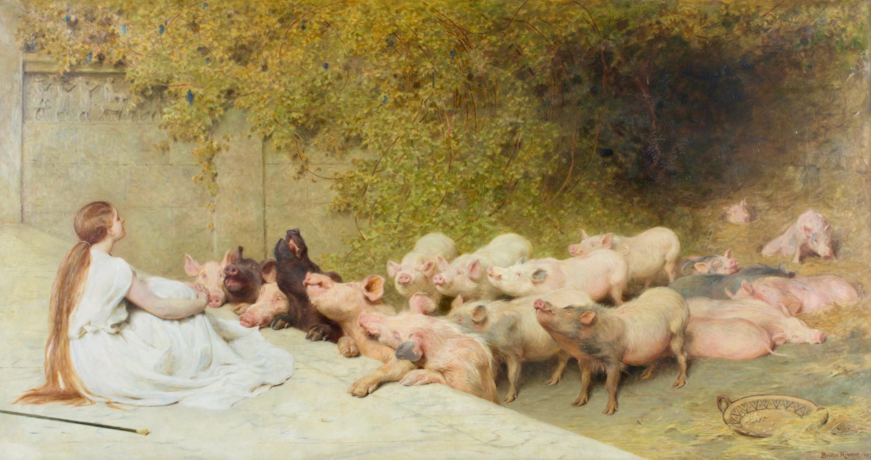 We take it that the men are still the men they were, though trapped inside pigs’ bodies and natures. Behind Blue Eyes is a song by the Who which suggests that their condition applies to anyone born with an human face, too. Even one with pretty blue eyes, which, by the way, I’ve known a pig to have. Perhaps lonely and misunderstood Polyphemus sings a song called Behind Blue Eye. “No one knows what it’s like …”